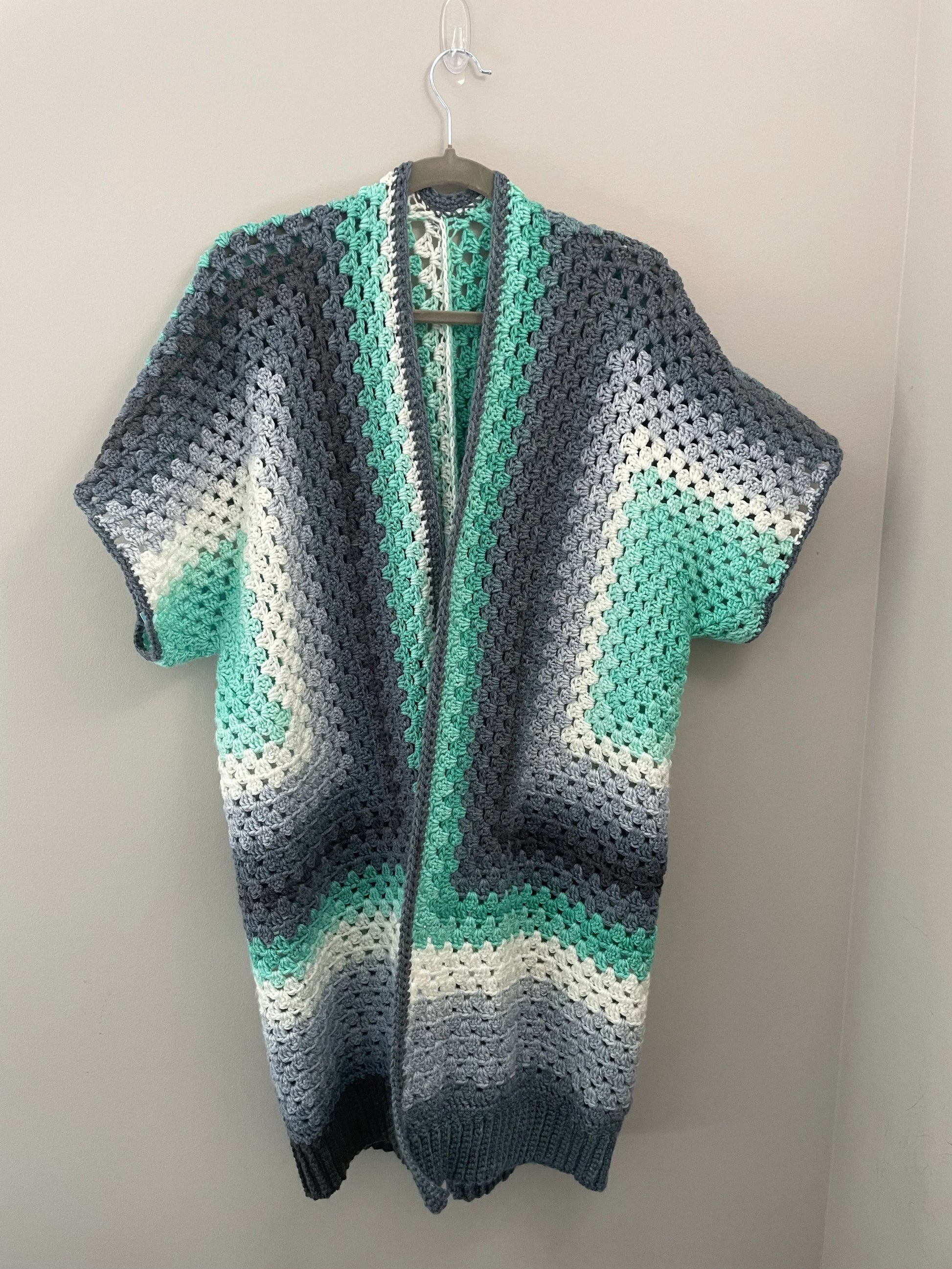 Sleeveless cardigan in greens and greys. Perfect for a lovely layered look. Whether you want something warm on a cool spring/summer night or looking to add an accent to your outfit, this cardigan could be an excellent edition to your wardrobe.